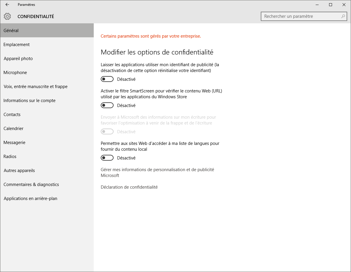 Si vous avez finalement utilisé la configuration par défaut à l’installation, vous pouvez tout aussi bien désactiver toutes les options de collecte de données dans les paramètres de confidentialité de Windows après installation. Comment faire?